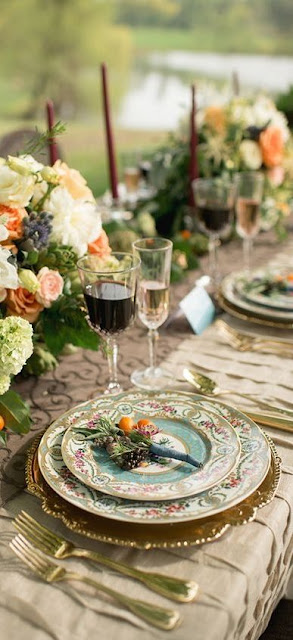 For me these garden wedding table settings are so stunning and something I won't soon forget. I want to dine on these gold-rimmed china plates near the beautiful pink and white azaleas we grow here in Virginia that were tricked into blooming early because of the heat. I want to drink Blackberry Merlot from golden vintage goblets under the shade of the flowering dogwood trees. An indoor reception makes you wonder - how long will this big party last? Do I need to order one more lemon drop martini ASAP before the bar shuts down and the band plays "So Long, It's Been Good To Know You"? An outdoor garden wedding reception suggests - stay and linger, breathe in the perfume of these red garden roses. This is the day of our dreams, so let's make these magic moments last.